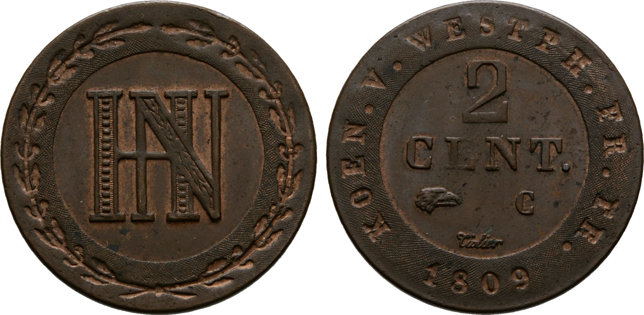 Das Königreich Westphalen entstand durch den Frieden von Tilsit (07.06.1807), welcher den preußisch-französischen Krieg beendete, und hielt bis in das Jahr 1813. Aufgelöst wurde das Königreich im Nachhall von Napoléons Niederlage in Russland 1812, als russische Truppen 1813 im Oktober/November Westphalen besetzten. Die alten Herrschaftsgeschlechter übernahmen daraufhin wieder die Kontrolle über ihre Besitztümer und das Königreich war aufgelöst. Der Souverän des kurzlebigen Königreichs war Jérôme Bonaparte, der jüngste Bruder Napoléons, unter dem offiziellen Namen Jérôme Napoleon oder auch Hieronymus Napoleon regierte er. Auf vielen der Münzen des Landesmuseums ist sein HN-Monogramm zu sehen (Abb. 1).